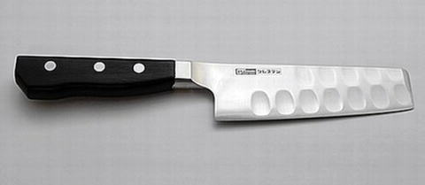 刃が角形タイプの三徳包丁です。昔ながらの角形包丁に親しみをお持ちの方にお勧めです。刃渡りは13pと短めの作りになっており、ご家庭での普段使いや面取りなど細かい作業に適しています。柄は、積層強化木を使用し、ツバ付きなので柄の付け根の強度が増し丈夫で、汚れもたまりにくい仕様です。