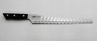 | ステンレス製などの硬質まな板にも使用できるように研究開発された包丁です(普通のまな板でもご利用頂けます) 刃身表面にくぼみを付け、刃先自体を凹凸のある形にすることで切り込む際の抵抗を減らし、切り込みやすくした刃です。従来の刃にはない鋭い切れ味が特徴でスライス用(ロストビーフやスモークサーモンなどのそぎ切り、完熟トマトのスライス)専用包丁としてもご好評頂いています。 主にステンレスまな板を使う精肉、鮮魚関係の方や、完熟トマト、果物を多くカットする業種の方々にご愛用頂いております。 ※受注後オーダー製作の為、完成までお時間を頂戴致します。工場の繁忙具合でお待ち頂く日数が変動しますので、受注後納期を確認しましてご連絡致します。ご了承くださいませ<(_ _)> |