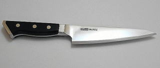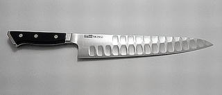 | 軟質まな板(木、プラスチック)用包丁。切断時に側面にかかる密着抵抗をディンプル加工=特殊形状(刃表面のくぼみ)を作ることで最小にしてあります。作業性に優れ、切れ味は最高です。しかも、刃とぎの面積が狭い為、ご家庭で刃砥ぎをして頂くときに、非常に砥ぎやすい設計です。ご家庭からプロの方まで幅広くご愛用頂いています。 | ||