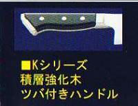 | 18-8ステンレスを使用しています。構造は中空で表面の隙間はありません。手入れが簡単で耐久性も高く、臭いもつかず錆びに強いので半永久的です。バランスは従来のグレステンを継承し、軽すぎず、重くない使いやすい包丁です。また、滑りにくいデザインになっています。 | 積層強化木を使用しています。ツバを付けることで、柄の付け根の強度が増し、汚れもたまりにくい仕様になっており、衛生的です。Mシリーズ同様均等のとれたバランスで使いやすい包丁です。 | 積層強化木を使用しています。ツバなしの為、MシリーズやKシリーズと比べるとバランス面や衛生面で少し劣りますが、刃の切れ味はM、Kシリーズと同様、最高の切れ味です。お手入れの際は、刃の付け根に汚れを残さないように洗浄してください。 |